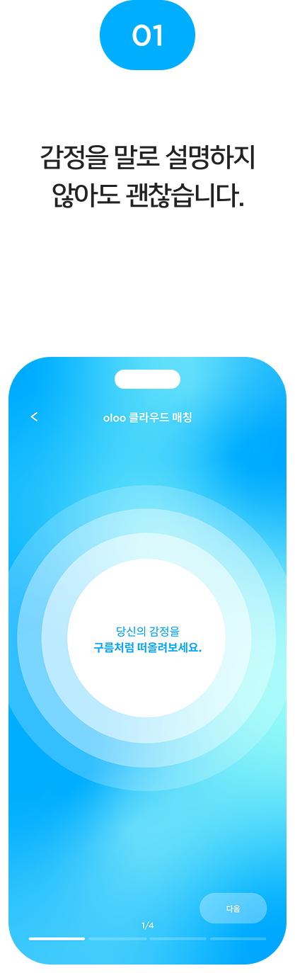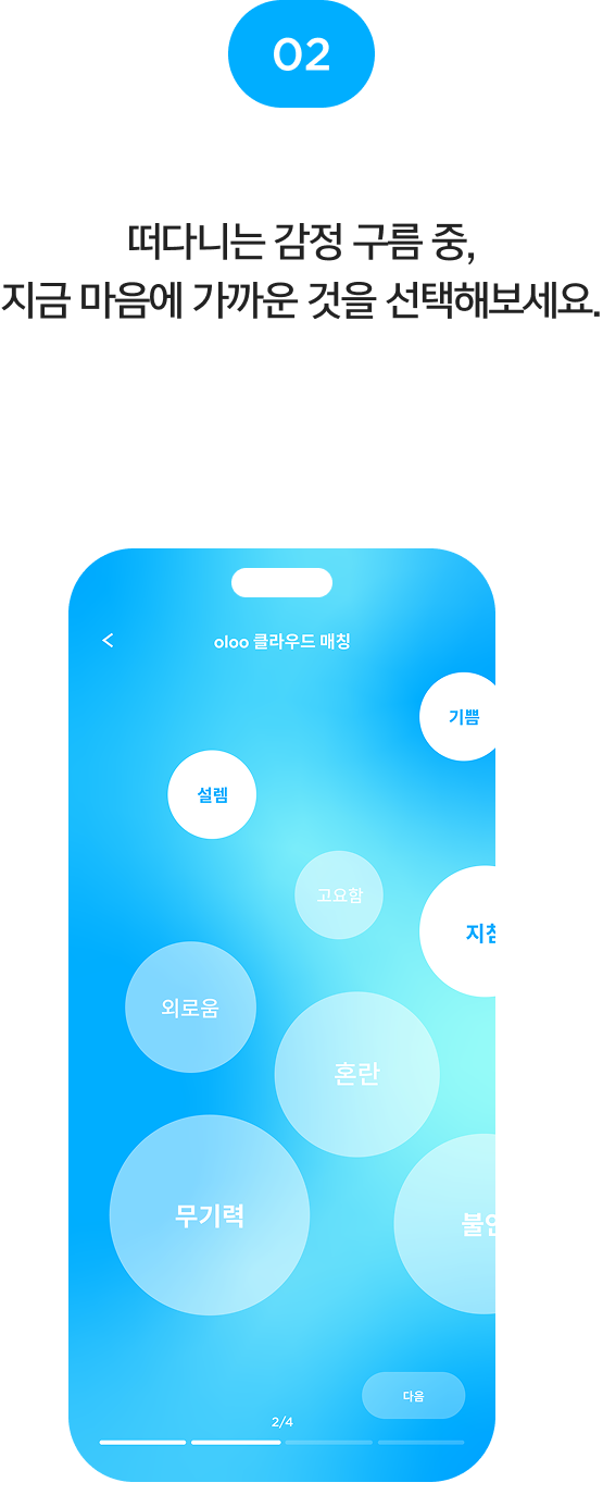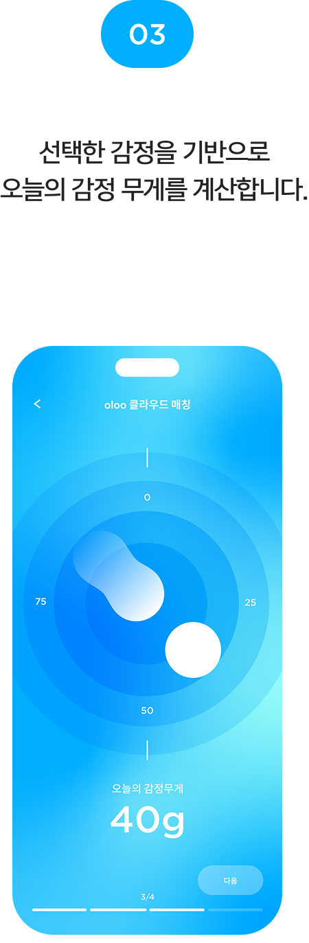 울루 감정 클라우드 매칭은 감정을 말로 설명하지 않고, 화면 속 떠다니는 구름 중 지금 마음에 가까운 것을 고르는 방식으로 진행됩니다. 선택한 감정은 무게로 환산되어 구름 오브젝트의 위치로 표현되며, 오늘의 내면이 얼마나 가볍거나 무거운지 직관적으로 확인할 수 있습니다.