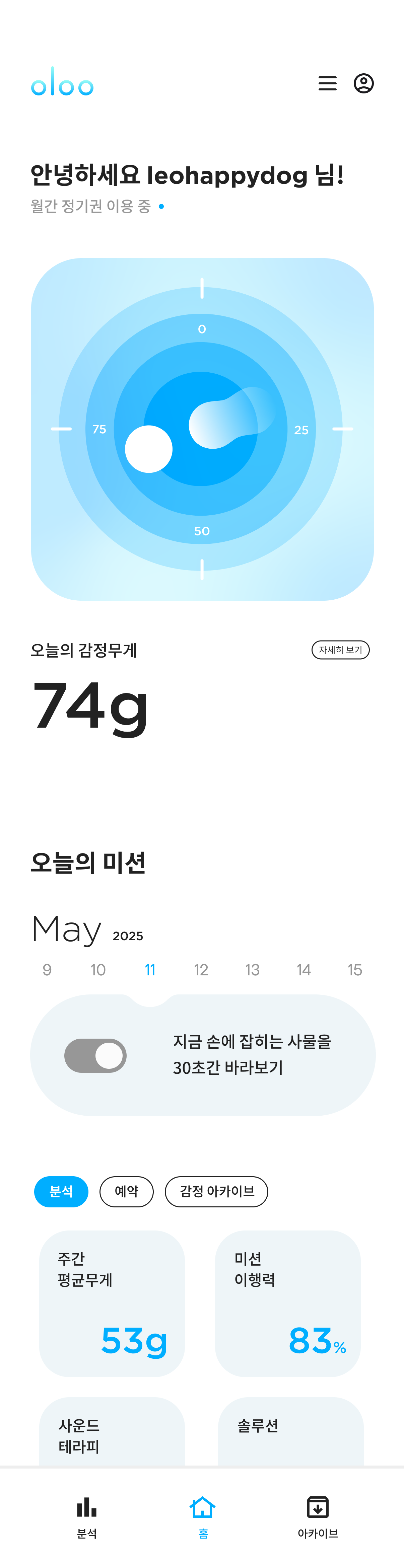 그날 그날의 감정 무게를 측정한 '감정 클라우드'의 무게와 그에 따른 오늘의 미션과 주간 분석 결과, 사운드 테라피 등의 정보를 메인 페이지에서 확인할 수 있습니다. 자세한 기록을 확인하려면 자세히 보기 버튼을 눌러 확인할 수 있습니다.